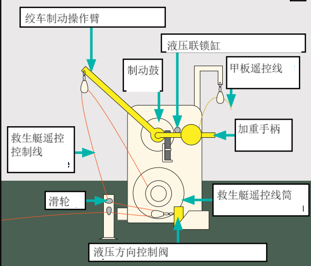 图4-5救生艇遥控拉线;收回液压联锁缸释放绞车制动操作臂