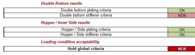某轮某满载装载状态海上工况的每个货舱及相邻货舱的局部强度校核结果。