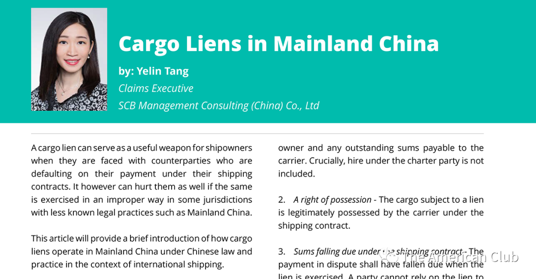 协会上海办公室的Claims Executive Yelin Tang (汤晔琳),在协会最新的期刊Currents上简要介绍了在国际运输中船东在中国大陆行使货物留置权的一些注意事项。