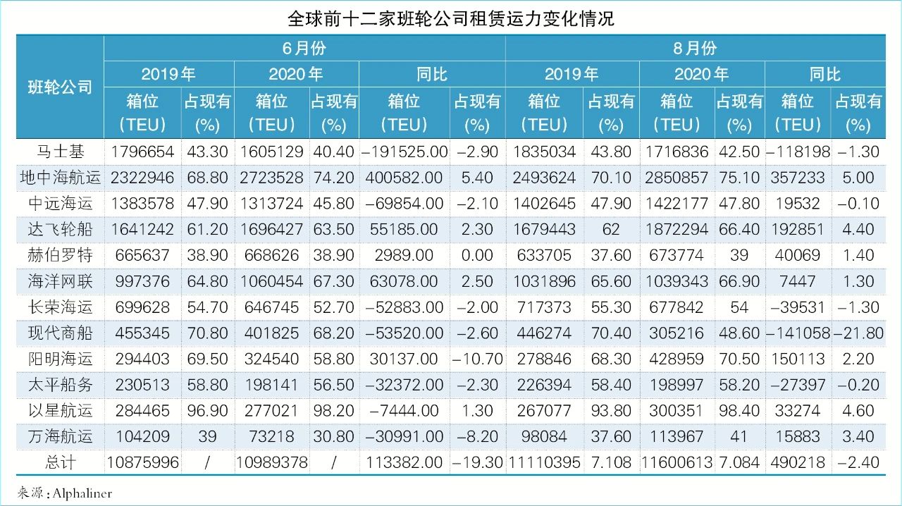 6月,市场回暖后对运力的需求剧烈增加,运价上升,班轮公司不断恢复航班,集装箱船闲置运力逐步回归市场。8月3日,全球班轮公司闲置运力占总运力的5.1%,为120.07万TEU(较5月25日减少152.21万TEU)。也就是说,随着市场回暖,短短70天左右,有150万TEU以上的运力重新进入市场。全球前十二家班轮公司集装箱船租赁运力同比增加49.02万TEU(见表)。
