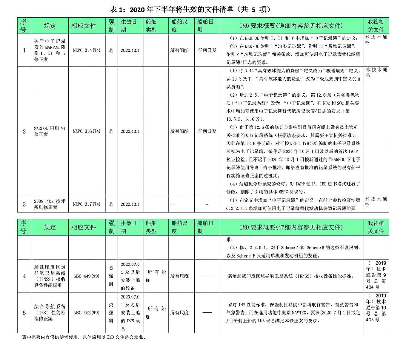 船厂、船用产品厂、船东和船舶设计单位注意啦!将于 2020 年 7 月 1 日至 12 月 31 日生效的国际海事组织(IMO)与船舶检验、发证有关的文件共 5 项(见表1),涉及《国际防止船舶造成污染公约》(MARPOL)和相关规则的修正案,均属强制性/类强制性文件。