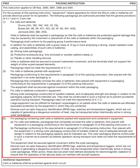 在包装导则P903中明确了“同时含有装在设备中和与设备包装在一起的电池或电池组”的锂电池类货物包装要求.相关信息见图7。