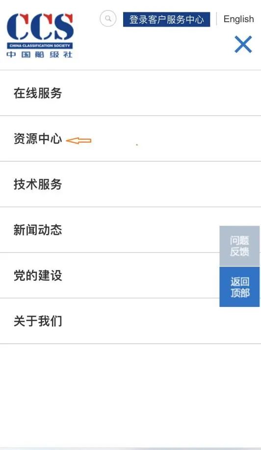 1、通过手机浏览器登陆中国船级社官网(https://www.ccs.org.cn/ccswz/)点击右上角栏目。