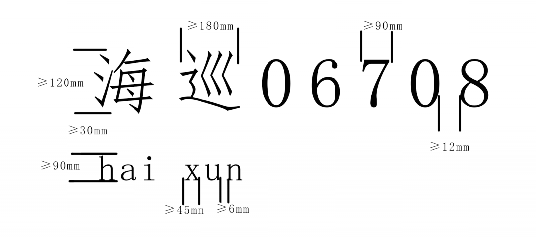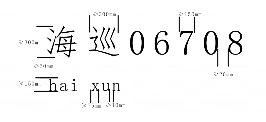 1.对于总吨大于等于3000的船舶,汉字字高不小于600mm、字宽不小于600mm,笔画粗细不小于40mm,间距不小于40mm;阿拉伯数字字宽不小于300mm,字高、间距及笔画粗细与汉字一致;汉语拼音字高不小于300mm、字宽不小于 150mm,笔画粗细不小于40mm,不同汉字的汉语拼音字母间应有明显间隔。汉语拼音与汉字之间行距不小于100mm。
