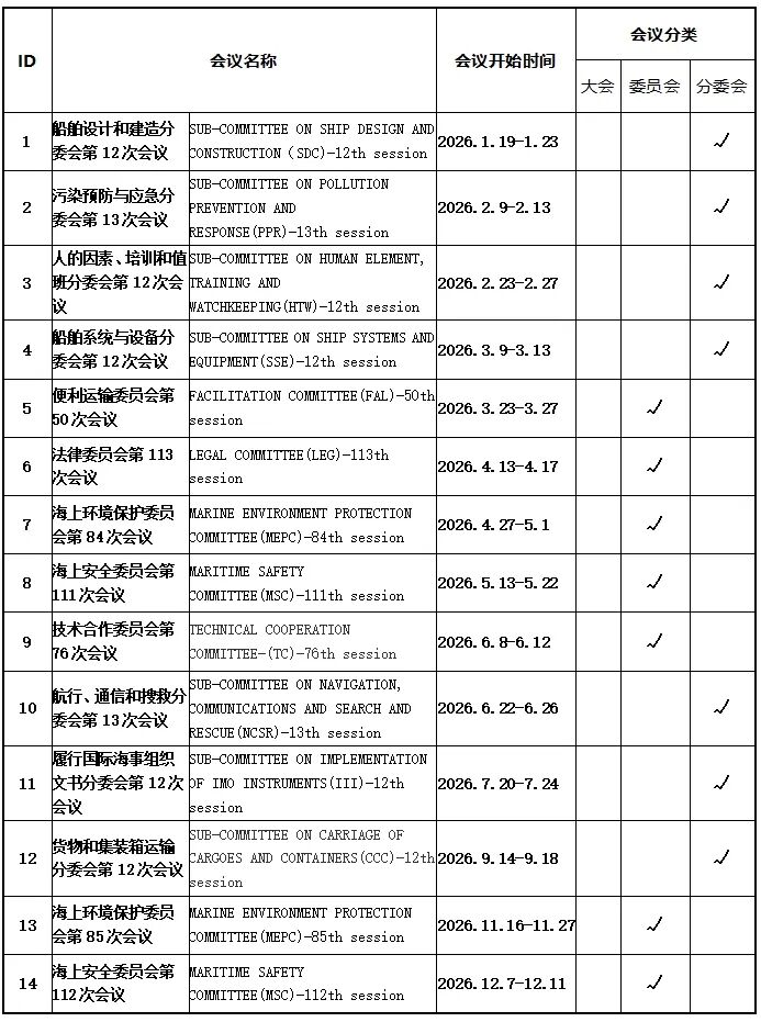 近日,国际海事组织更新了2026年会议计划,其中五个委员会和七个分委会共召开14次会议,计划时间如下: