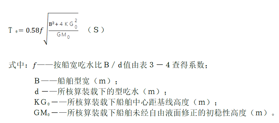 我国《法定规则》中提供的横摇周期(自摇周期)Tθ与GM0的关系式为: