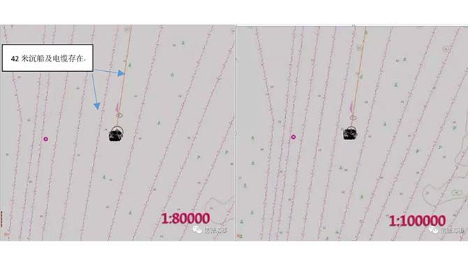 如上图所示,将该区域的比例尺逐步放大,这个过程中我们发现,原先在小比例尺时还显示的沉船及电缆,在1:70000之后消失。如果盲目地放大比例尺,而船舶又在存在电缆或者沉船处抛锚,将会造成巨大的损失。