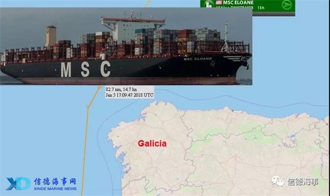 信德海事网1月8日消息,据西班牙海事搜救协调中心消息,由于不良气象条件以及恶劣海况的影响,MSC旗下运营的一艘名为MSC Eloane的超大型集装箱船舶在西班牙 加利西亚海岸以外大约40海里处上的大约30-45各40英尺集装箱落海。