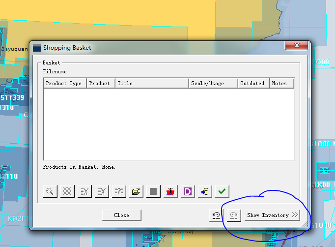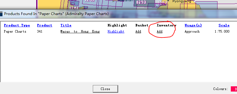 ⑦:鼠标右键点击航线经过区域的浅蓝色的海图,出现图2-15,两个画圈部分为“购物车”和“库存”显示,黄色高亮为现有的海图,点击“Basket”的“Add”出现如图2-16,红色高亮部分为加入购物车的海图,大家可以看到我圈起来的部分,为海图的用途和比例尺,大家可以根据需要申请相应的海图。
