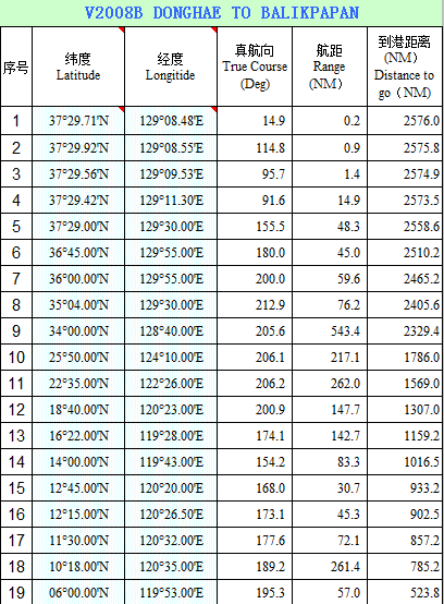 ③:当然也可以导入你准备好的航线,以便准确申请电子海图,首先相信大家都会准备好一个这样的航线计划表格或者从ECDIS上面导出各个经纬度转向点列表,如图2-4: