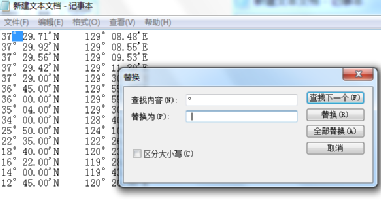 新建一个“txt文档”,把经纬度复制到新建文本文档里面,如图2-5,然后利用文档的替换功能,把图2-5中画红圈的部分替换成空格,如图2-6: