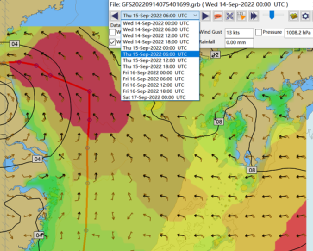 以我轮本航次SURIGAO至连云港航次为例,我轮09.12号装完货开航,按照上述步骤收取相关GRIB文件,与气导公司的工作流程相同,根据开航时间船位,本船航速在航线做好推算船位然后把获取的气象信息发船