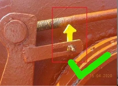 上面这段话也可以理解为,当测试完成并校准刹车设置后,需要用标记装置标记绞车,以确保每次系泊作业时刹车施加相同的扭矩。为了保证施加扭矩的准确性,就必须使用锐利而牢固的标记,因为刹车螺杆的螺距很大,刹车转动一圈就会导致较大的行程(见上“螺距”图)和刹车力。标记装置的设计应使在紧急情况下不妨碍进一步拧紧刹车手柄,并具有适当的结构,以便在常规测试之间保持在适当的位置和良好的状态。不可接受和可接受的标记设计举例如下: