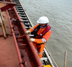 14)GANGWAY 和PILOT LADDER 上面的码克必须做到位,另外引水梯与甲板连接处不允许使用卸扣,必须使用同等材质的绳子进行板扎,为了便于收回引水梯大家习惯性的绑一根绳子在引水梯上,这跟绳子要求不能绑的过低,一般要求至少在第一根横档的位置,另外绳子不能朝向船尾,这个也是经常被投诉的项目
