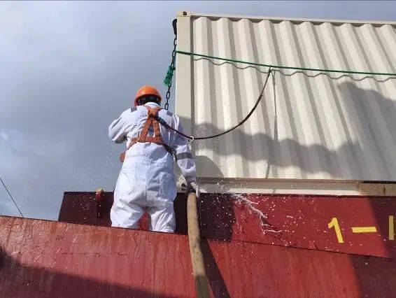 《ii》然后开始两人一组用消防皮龙对集装箱各个部位,顶面、立面、四角容易生虫害及残留垃圾部位进行海水冲洗,3-4人一组使用扎眼的消防皮龙,360度旋转无死角对集装箱底部冲洗除虫。(3次)