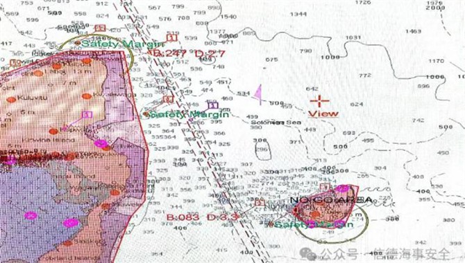 在用电子海图做 Safety Margin 的 user chart 时也有技巧,AMSA 把 Safety Margin 定义为航线至安全等深线之间的海域,所以在航线和周围 no go area 之间的海域 就算是 Safety Margin。在这些海域做一些 Safety Margin的标注即可。想必以上方法能满足 AMSA 关于航海通函 09/2024 的要求。