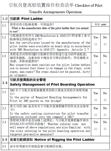 五.引航梯的告知书和引航员登离船装置操作检查清单