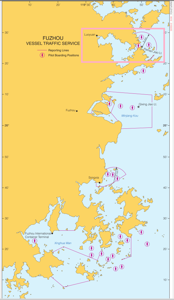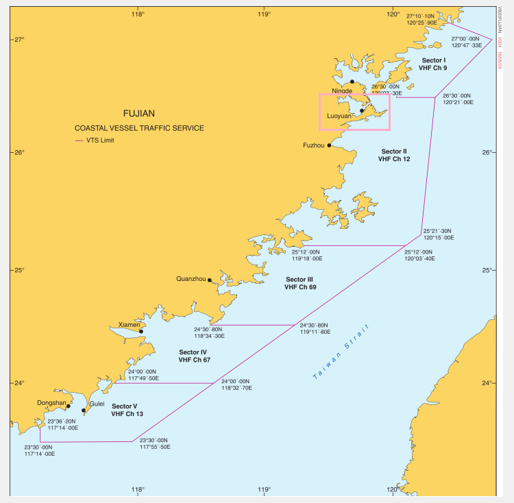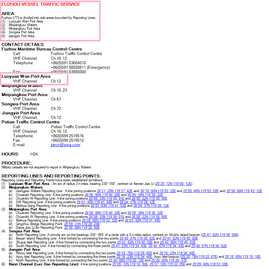 -- Fuzhou Vessel Traffic Service (罗源湾的VHF为CH12/16)