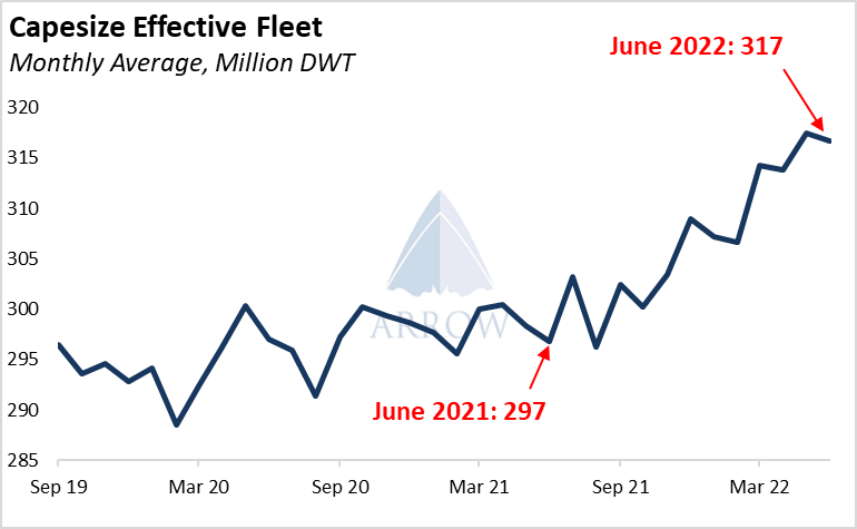 From mid-2020 until the start of this year, effective fleet growth in the Capesize market was around zero. Progressively higher congestion levels were hiding vessel deliveries. However over the past 6 months we have seen congestion drop back, and this has revealed nearly 2 years’ worth of vessel deliveries: year-over-year effective fleet growth is at 6.8% for the Capesize market.