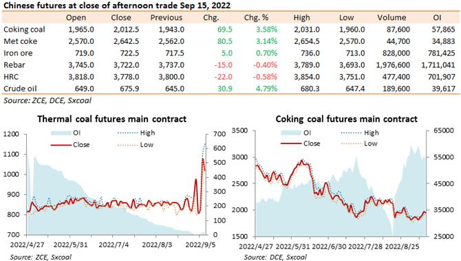 - Check out latest updates on the Chinese futures market for thermal coal, coking coal, coke and others at close. Source: Sxcoal The opinions expressed herein are the authors and not necessarily those of The Xinde Marine News. Please ContactSxcoal2022-09-16 10:38:34