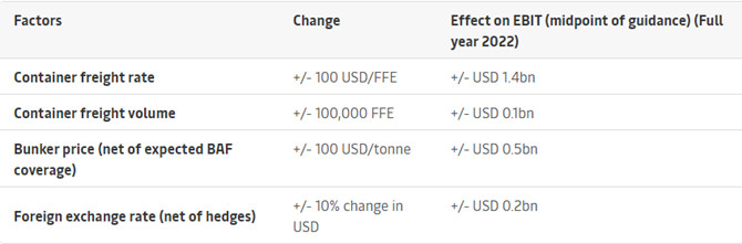 Financial performance for A.P.Moller - Maersk for the full year 2022 depends on several factors and is subject to uncertainties related to COVID-19, bunker fuel prices and freight rates given the uncertain macroeconomic conditions. All else being equal, the senstivities for the full year 2022 for four key assumptions are listed in the table below: