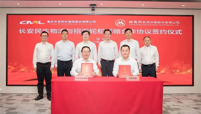 27 July 2023 - CMES Shipping and Changan Minsheng APLL Logistics Co., Ltd. (CMAL) held a signing ceremony of a strategic cooperation framework agreement in Shenzhen. CMES President Wang Yongxin and CMAL General Manager Wan Nianyong attended the event and witnessed the signing. Sun Jianfeng, Vice President of CMES and Chairman of China Merchants RoRo (CMRORO), and Ren Fei, Chief Accountant of CMAL, signed the agreement on behalf of their respective companies.