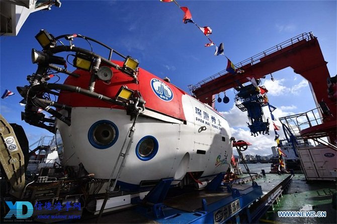 Members of the test team of the manned submersible named Shenhai Yongshi, or deepsea warrior, on board the ship Tansuo-1 wait to arrive at port in Sanya, south China's Hainan Province, Oct. 3, 2017. China's new manned submersible, on board the ship Tansuo-1, returned to port in Sanya on Tuesday, after completing deep sea testing in the South China Sea. The manned submersible named Shenhai Yongshi reached a depth of 4,500 meters to test its functions and performance during an over 50-day expedition. (Xinhua/Guo Cheng)