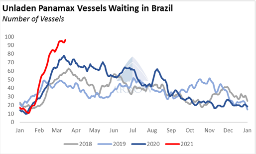 Panamax congestion in Brazil has soared over the past 2 months as a flood of vessels arrived at Brazil a bit early, but now congestion is likely around a peak as the fast export pace clears though the line-up.