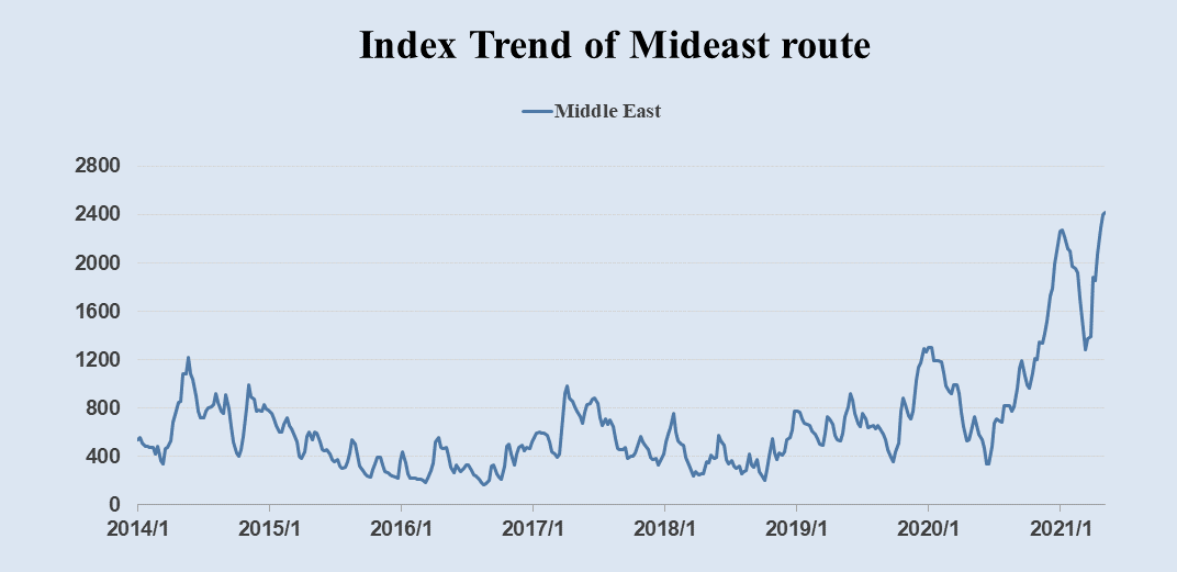 Mideast route: Duringthe May Day holiday, carriers mainly stock up cargo, and the freight rates forspot bookings were generally stable. This week, freight index in the route fromNingbo-Mideast quotes 2415.9 points, having a week-on-week increase of 0.8%compared with last week.