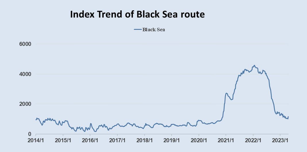 Black Sea route: The transportation demand continues to recover, and most carriers push up freight rates. This week, freight index in the route from Ningbo to Black Sea route quotes 1171.7 points, up by 15.6% against last week.