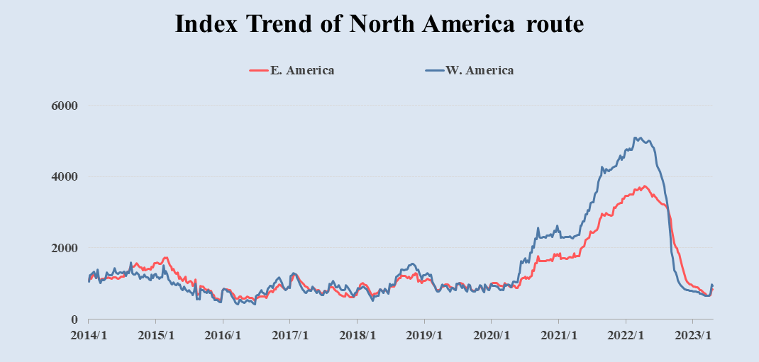 Europe and Mediterranean routes: The shipping space of the Europe route is generally sufficient, and the transportation demand is stable. Therefore, the freight rate of the route fluctuates steadily. This week, freight index in the route from Ningbo-Europe quotes 549.4 points, down by 1.5% from one week ago. Freight indices in the routes from Ningbo to East Mediterranean and West Mediterranean quote 869.2 points and 983.1 points, growing by 0.6% and having a decrease of 1.1% against last week respectively.