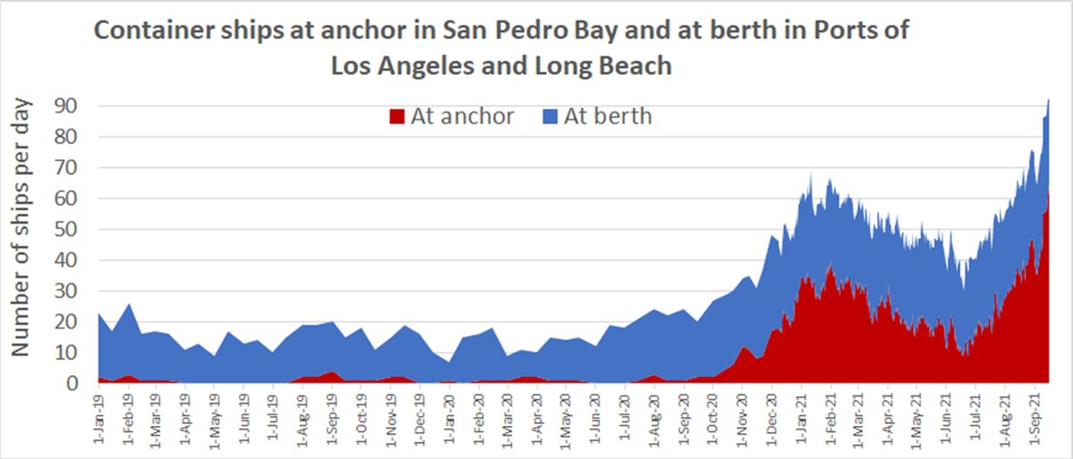The higher the number of ships waiting offshore, the bigger the queue and the longer it takes for a vessel to get a berth. On Thursday, the average wait time to reach a berth in Los Angeles rose to an all-time high of 8.7 days.