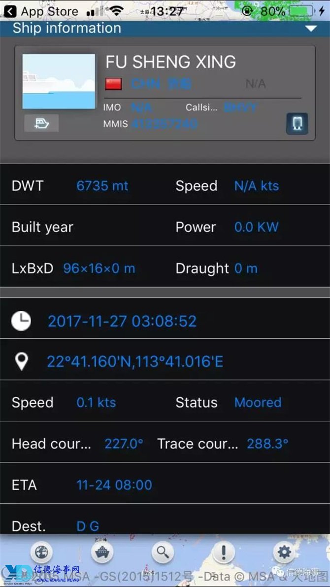 根据中国海事AIS信息服务平台查询锦泽轮信息显示,其原名为FUSHENGXING,而根据现场捡到的该船EPIRB的船名也确认为该船(MMSI码相同)。如下: