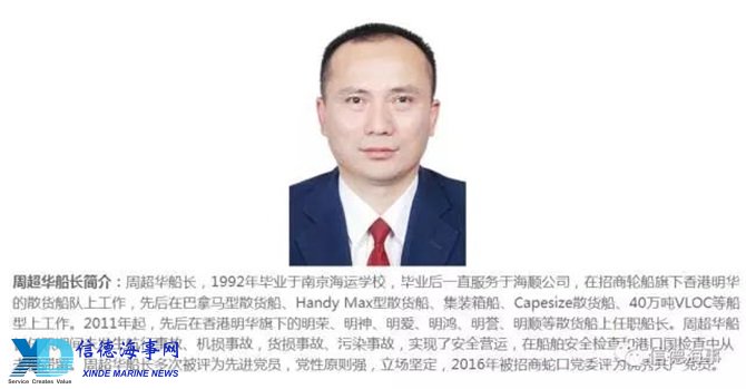 而信德海事网相信,随着周超华船长成为40万吨超级矿砂船(VLOC)船长中国第一人之后,第二位、第三位诸如周船长一样能够胜任诸如VLOC的更大更先进技术水平要求更高的船长、轮机长也将很快涌现出来。