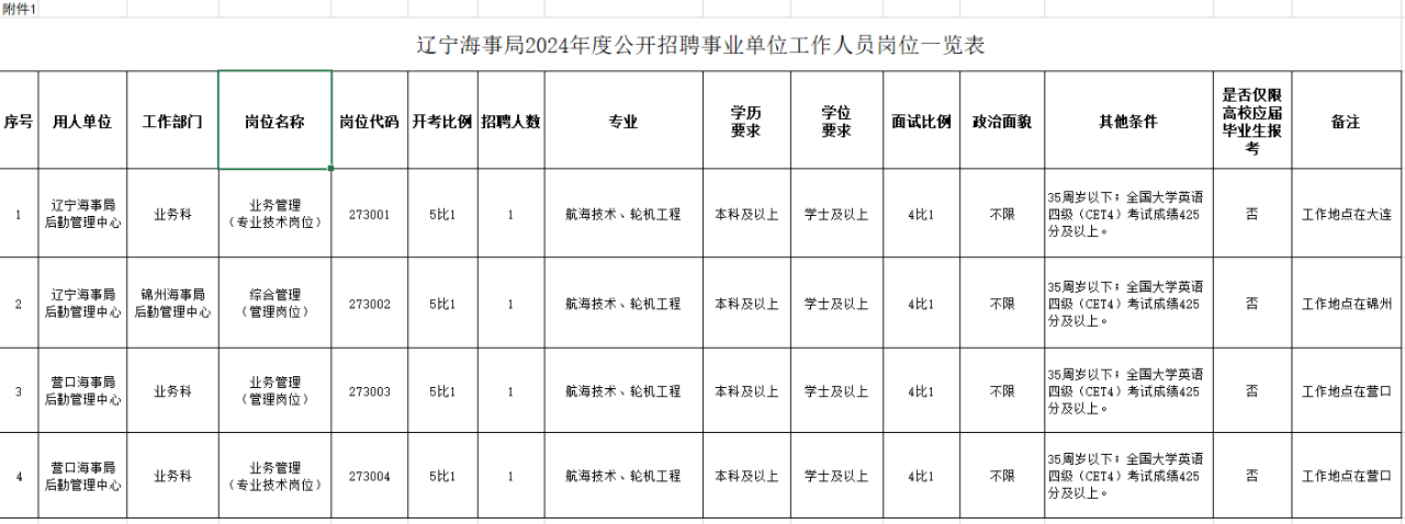 1.辽宁海事局2024年度公开招聘事业单位工作人员岗位一览表