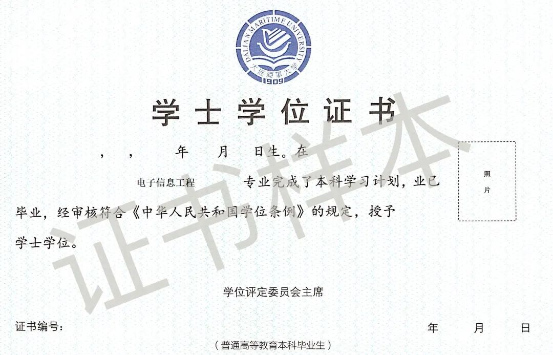 (1)中方证书:大连海事大学本科毕业证书(机械设计制造及其自动化专业;或土木工程专业;或电子信息工程专业)、工学学士学位证书;