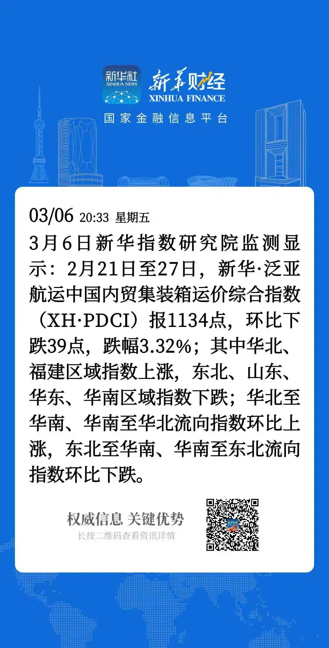 新华·泛亚航运中国内贸集装箱运价指数周报(XH·PDCI)2026.3.6