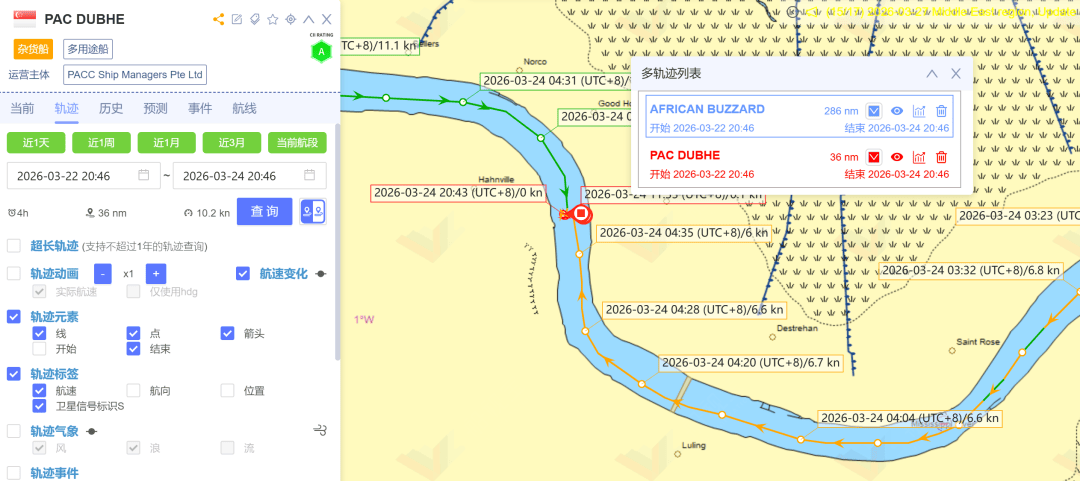 今年大年初二,一艘名为“胡志明平泽”(HEUNG-A HOCHIMINH)的集装箱船舶(船长172.2米、船宽27.5米、吃水9.4米)在从外高桥集装箱码头离泊在进入多股船舶流汇聚、船舶密度较高的圆圆沙警戒区时,该轮因动力管路压力不足导致船舶失控。同样是在该轮引航员的紧急处置下,避免了一场重大事故的发生。