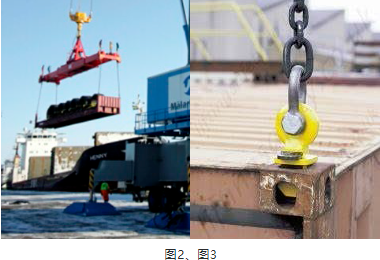 有时,吊具不能直接连接到集装箱顶部,在这种情况下,考虑使用垂直链通过挂钩连接到顶部和末端孔(图2)或角接头 (图3)。