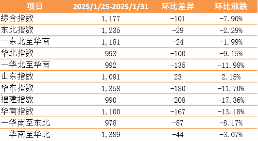 东北区域:春节假期上下游客户基本停工,市场运量以前期囤货为主。本期东北指数报1235点,环比下跌29点,跌幅2.29%,其中东北至华南指数报1181点,环比下跌24点,跌幅1.99%。