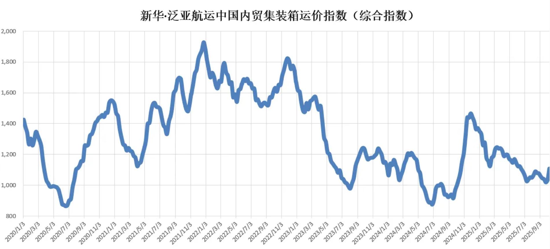 核心提示:本期(10月4日至10月10日)新华·泛亚航运中国内贸集装箱运价指数(XH·PDCI)报1109点,较上期(9月27日至10月3日)上涨73点,涨幅7.05%;同比上涨73点,涨幅3.70%;6只区域子指数全部上涨,4只流向指数三涨一跌。