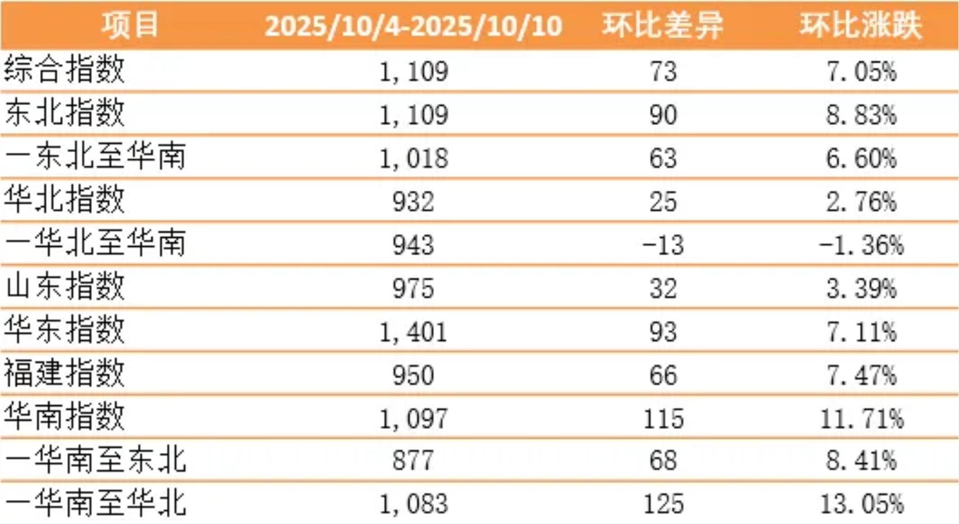 此外,山东指数报975点,环比上涨32点,涨幅3.39%;华东指数报1401点,环比上涨93点,涨幅7.11%;福建指数报950点,环比上涨66点,涨幅7.47%。