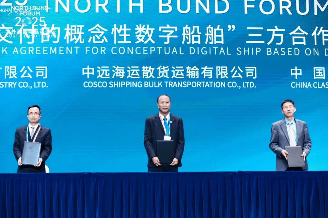 中远海运散货运输有限公司副总经理李志强、中远海运重工有限公司副总经理严承祥、中国船级社副总裁江亚峰,代表三方签署“基于数字化交付的概念性数字船舶”合作框架协议。这份以《数字船舶白皮书》为方向指引,以中国船级社发布的《船舶数字化交付指南》为技术依托,以32.5万载重吨矿砂船示范项目为实践载体的协议不仅是三方合作新起点,更是船舶行业数字化转型的新动力。