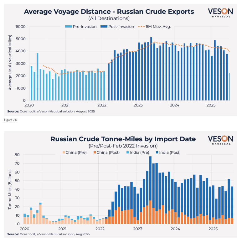 第二,中印需求驱动的航程延长。俄乌冲突后,欧洲减少俄罗斯原油进口,中国和印度成为主要买家,航程从约1,500海里骤增至逾12,000海里,“吨海里效应”消化了8–10%的全球VLCC运力。尤其是印度自俄原油进口量暴增逾12倍,为老旧VLCC提供了稳定的就业市场,中国船东通过运力调配实现国内进口与印俄贸易的双重收益。
