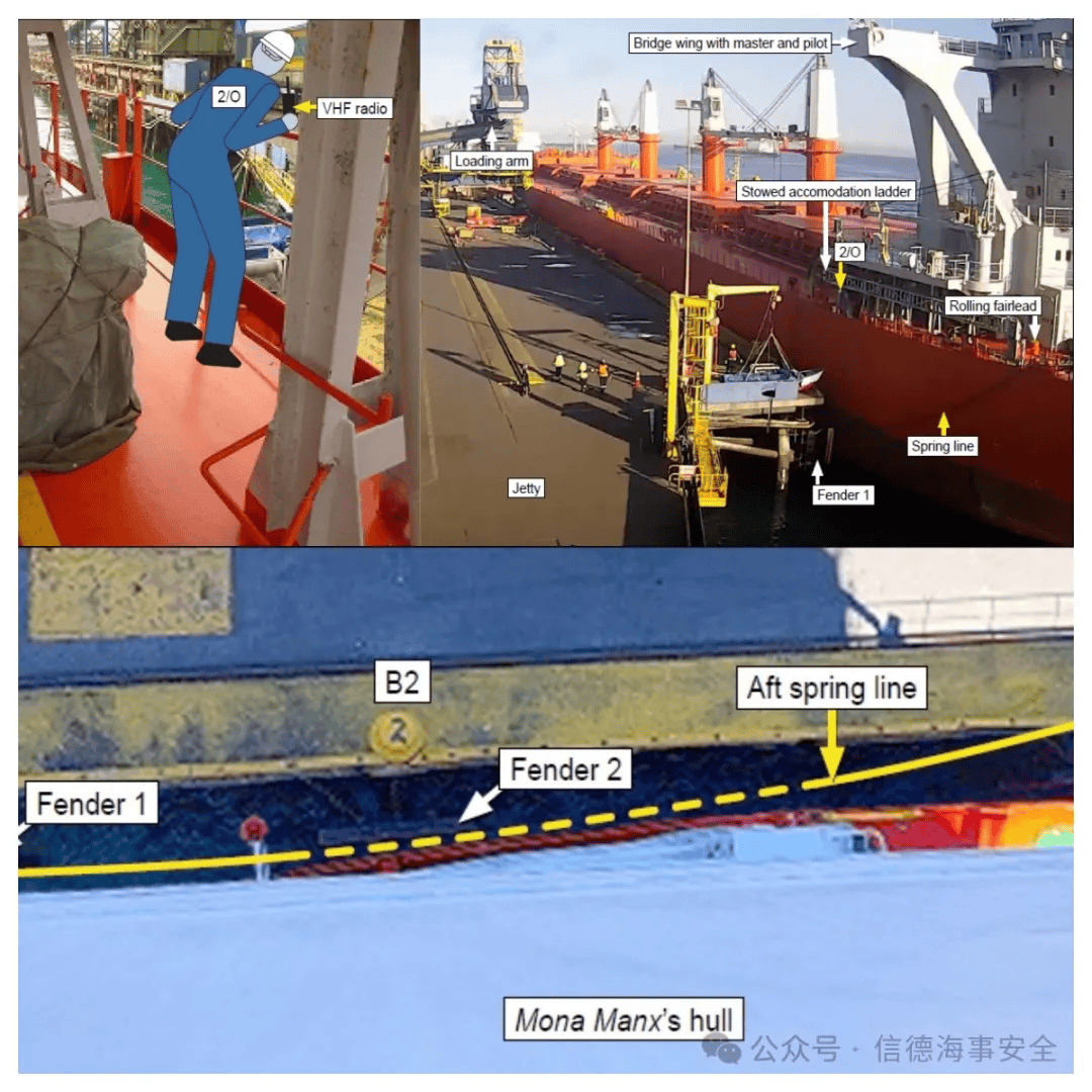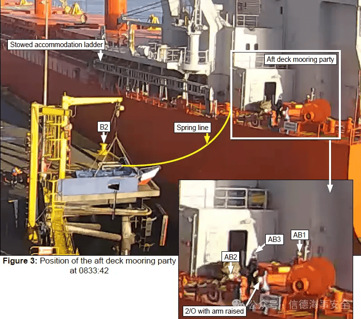 0836时31秒,悲剧发生了,码头带缆工人走向拉紧的缆绳时,缆绳突然释放并向上回弹,击中二副下巴,二副被抛起后头部撞到身后上方的舷梯,安全帽脱落,VHF无线电掉入水中,他倒在甲板上。