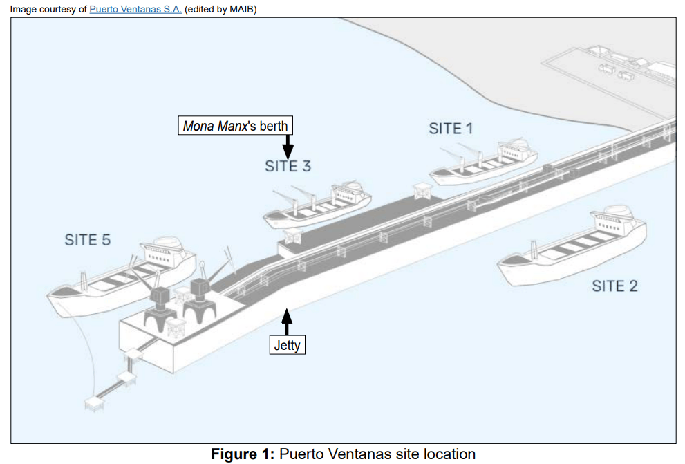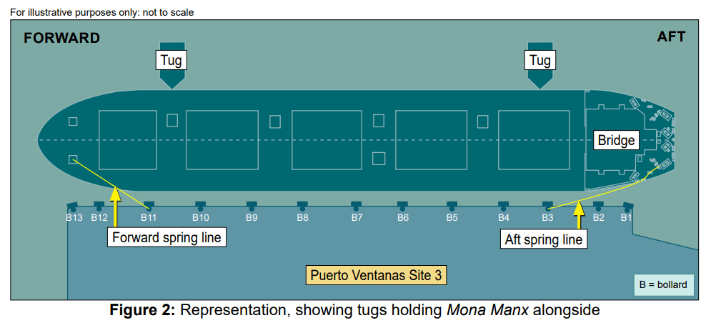 2021年8月26日,悬挂曼岛旗的散货船 Mona Manx 在智利瓦尔帕莱索港靠泊时发生一起致命事故,导致其二副(2/O)因被回弹的系缆绳击中而不幸身亡。事发时,系缆绳可能被夹在船体与码头之间的某处(可能是靠垫区域),随后在船舶依靠自身动力倒车操作时突然松脱,导致悲剧发生。