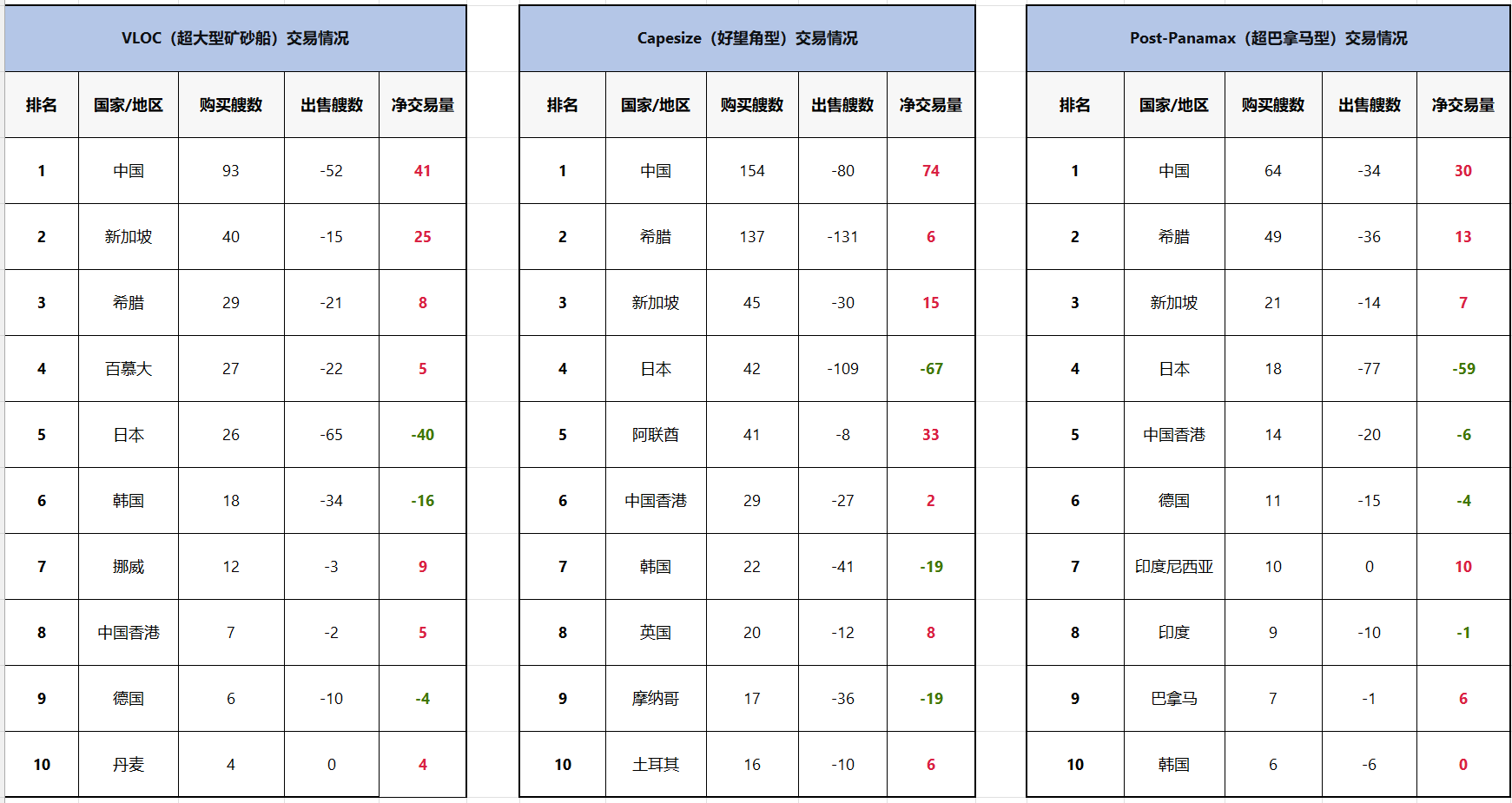 此外,希腊作为传统航运大国,仍保持全面参与,尤其在Handysize和Panamax船型中交易活跃,显示出其在中小型散货船市场上的持续影响力。