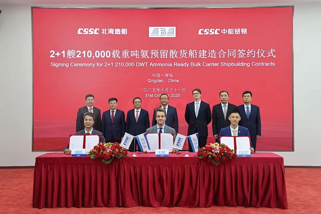 10月31日,EBE与青岛北海造船及中船贸易正式签订 2+1艘21万吨级Newcastlemax氨燃料预留型散货船建造合同。签约仪式由EBE首席执行官 Basile Aloy、北海造船总经理助理 尹海军 和中船贸易船海业务二部副总经理 黄重阳 共同签署。