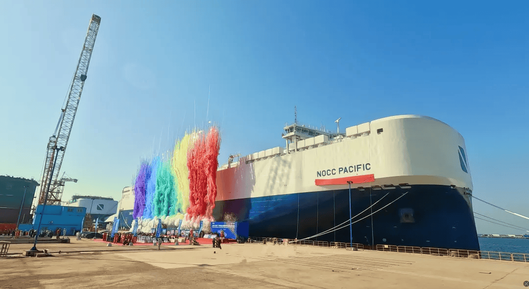 近年来,龙口基地已经跃居为全球主流的汽车运输船建造基地之一,中集来福士与瑞典航运Wallenius Lines、希腊航运企业Atlas Maritime、摩纳哥国际航运公司Zodiac Group等先后签订了多艘系列汽车运输船。“NOCC PACIFIC”是中集来福士交付的第15条汽车运输船,也是龙口基地2025年交付的第7艘汽车运输船,进一步巩固了中集来福士在汽车运输船(PCTC)领域的批量交付能力和领先地位。