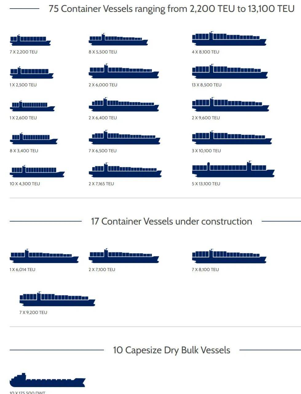其官网信息显示,Danaos Corporation 目前运营着一支规模可观、层次完整的集装箱船队,总量为75艘,覆盖从 2,200TEU 区域支线船,到 13,100TEU 干线大型船舶的全航线需求。其船队结构呈现明显的“中型船为核心”特征,4,000—9,000TEU级别的船舶占比最高,也是公司近年来持续加码的运力区间。此外,Danaos当前还有十余艘中型船舶处于建造阶段,将在未来两到三年内陆续加入船队,进一步巩固其在全球集装箱船租赁市场的地位。除集装箱船外,公司亦拥有少量海岬型散货船,作为资产组合的补充,使整体运营结构更具有抗周期能力。